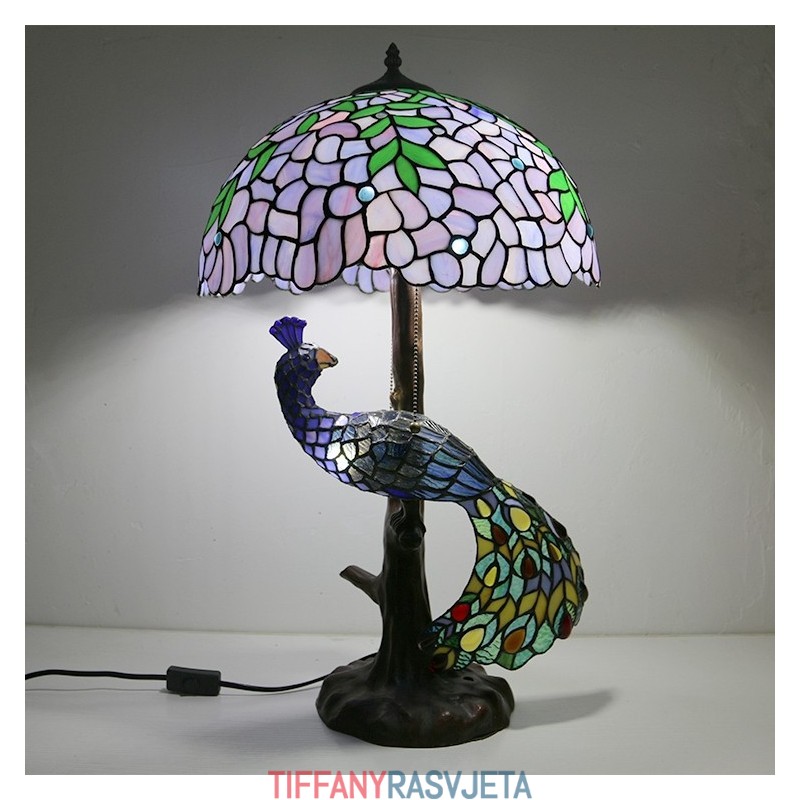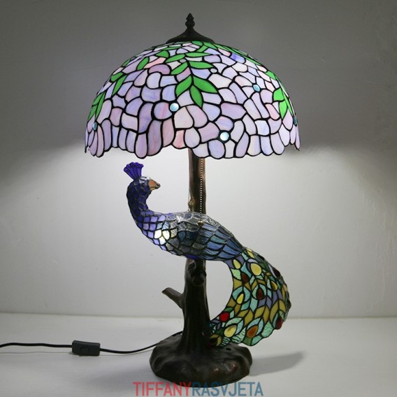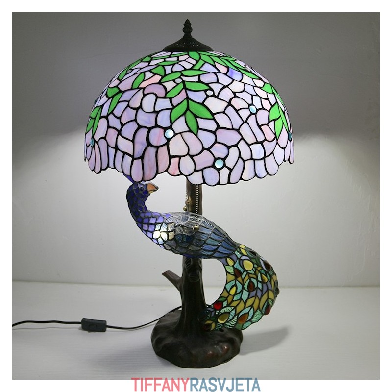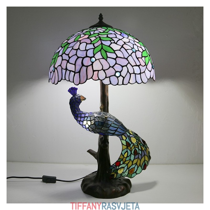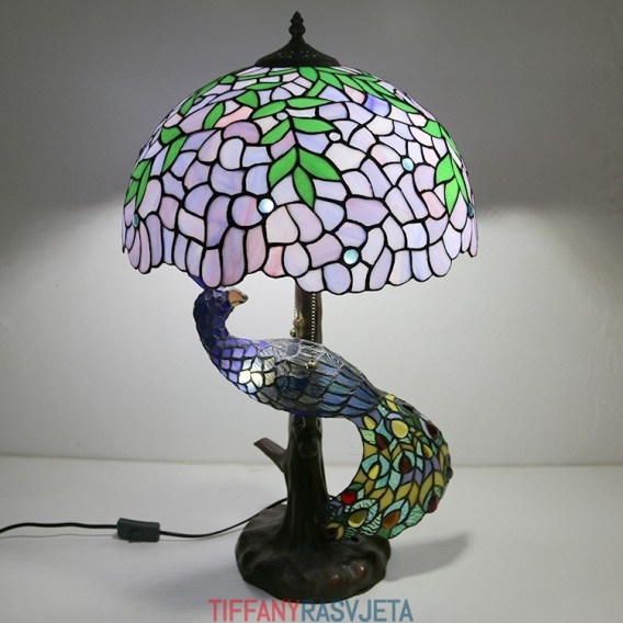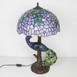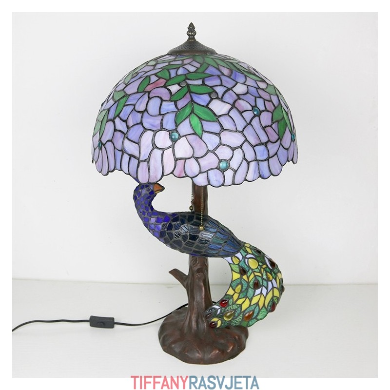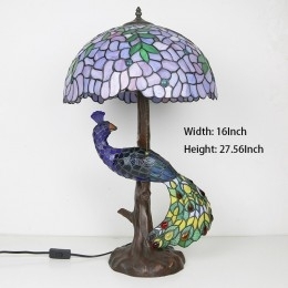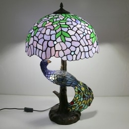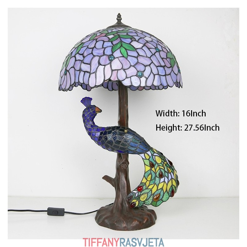 Ručno izrađena vintage stolna lampa u stilu Tiffanyja s podlogom u obliku pauna, 16 inča, antikna vitražna lampa s motivom glicinije, stolna rasvjeta