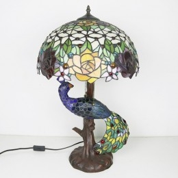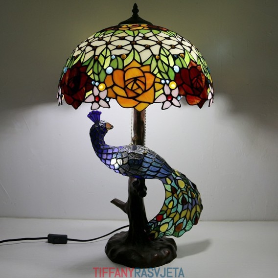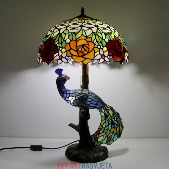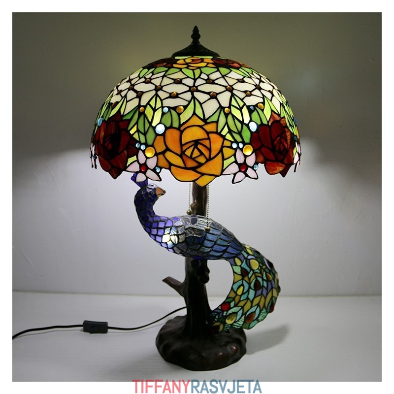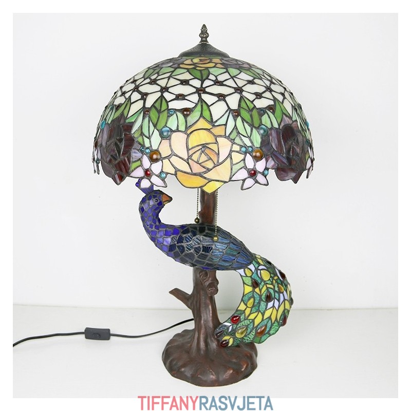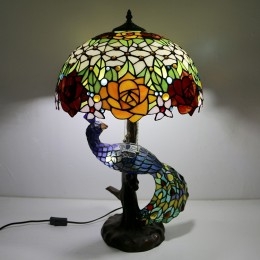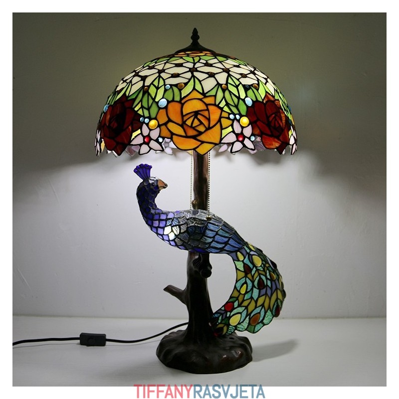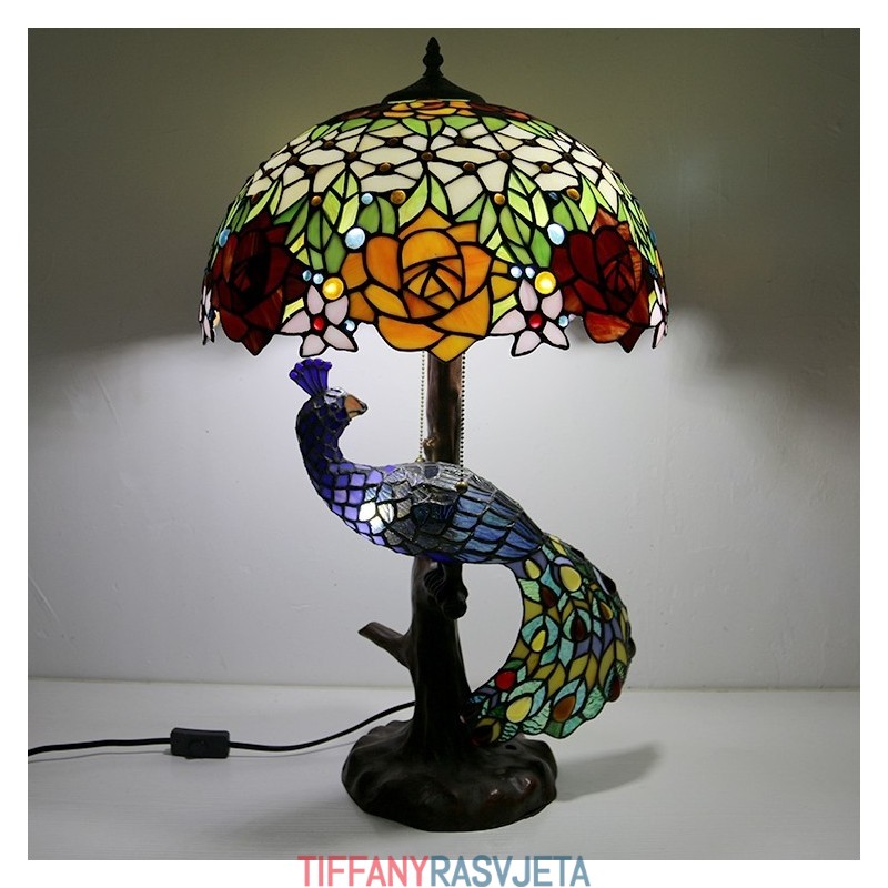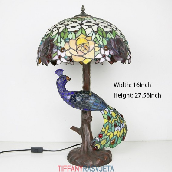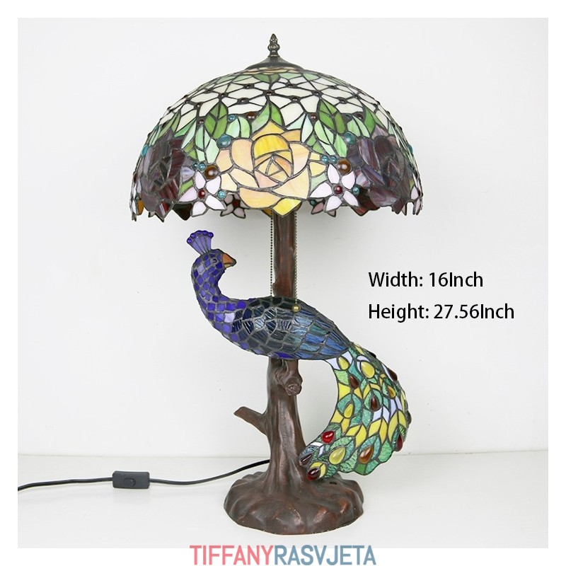 Ručno izrađena vintage stolna lampa u stilu Tiffanyja s podlogom u obliku pauna, 16 inča, antikna vitražna lampa s motivom cvijeta ruže, stolna rasvjeta