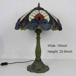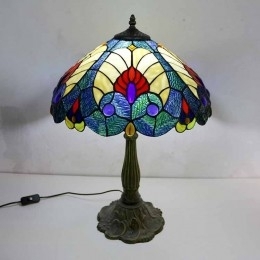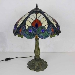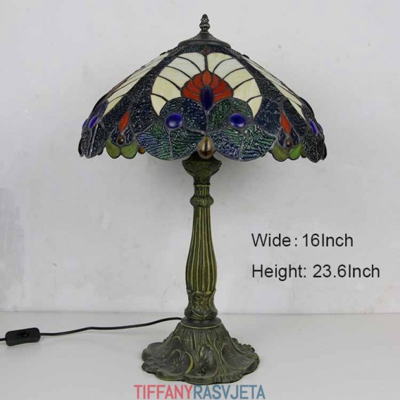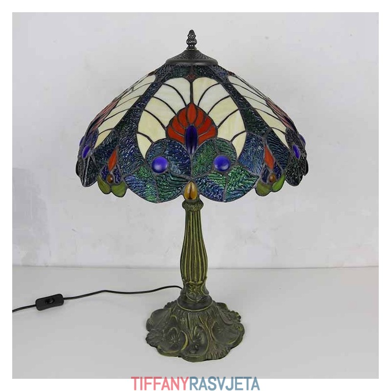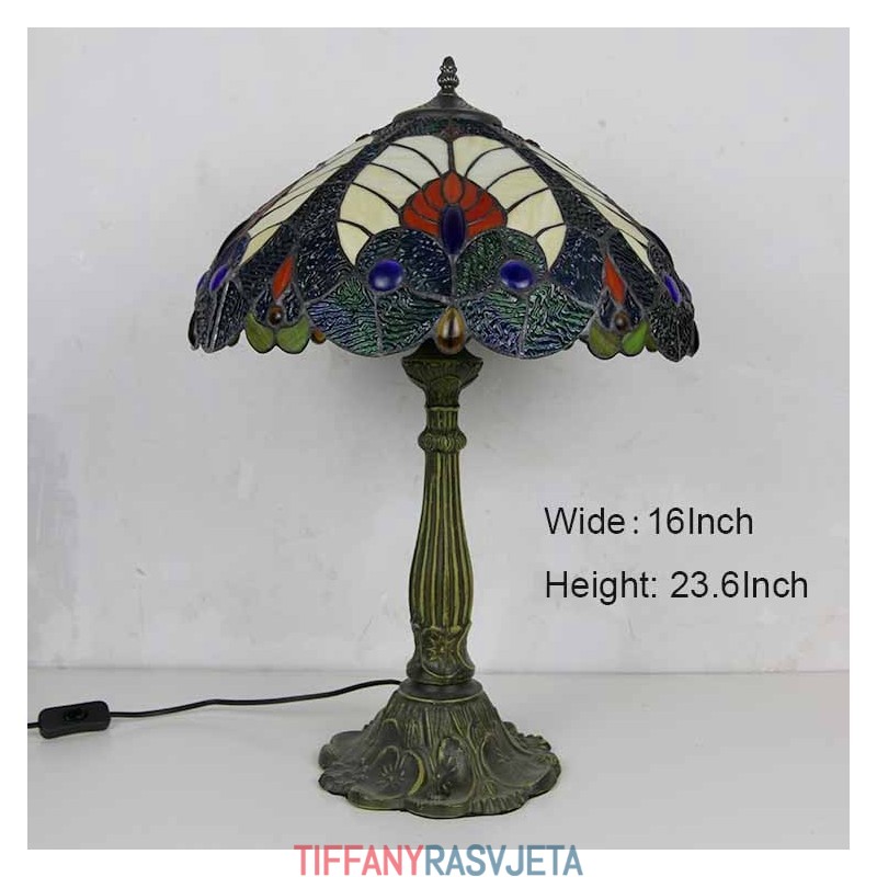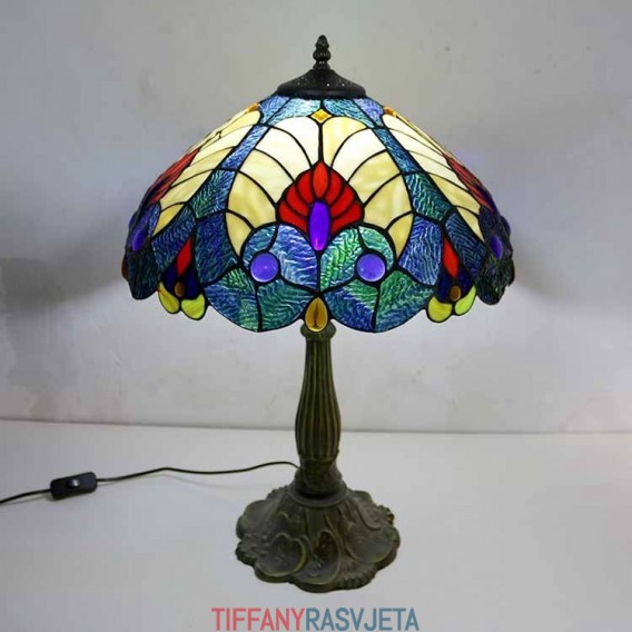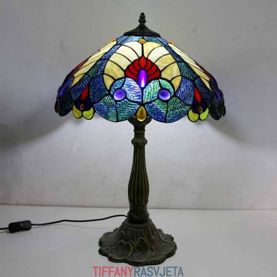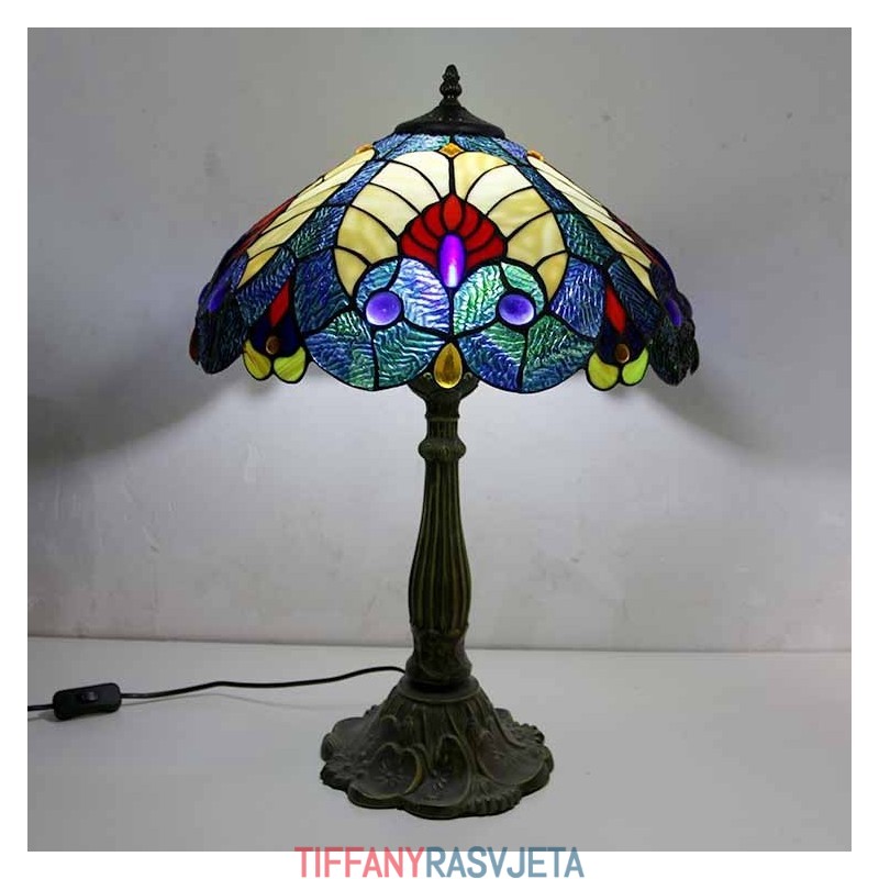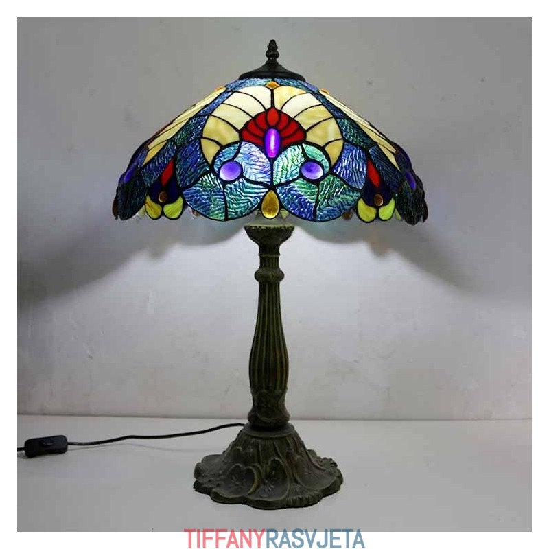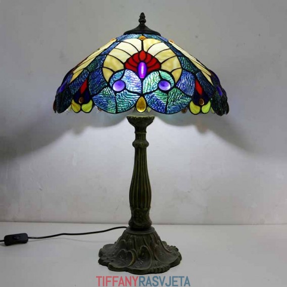 Ručno izrađena vintage kraljevsko plava stolna lampa od vitraja u Tiffany stilu sa širokim abažurom od 40 cm i podnožjem od legure cinka