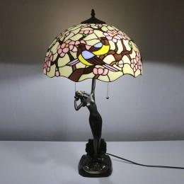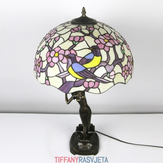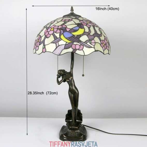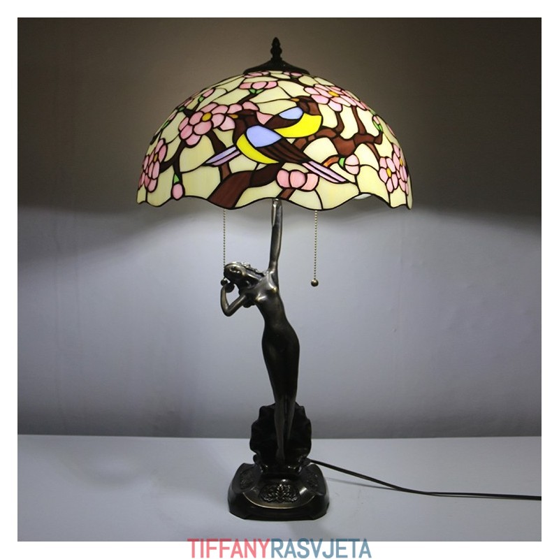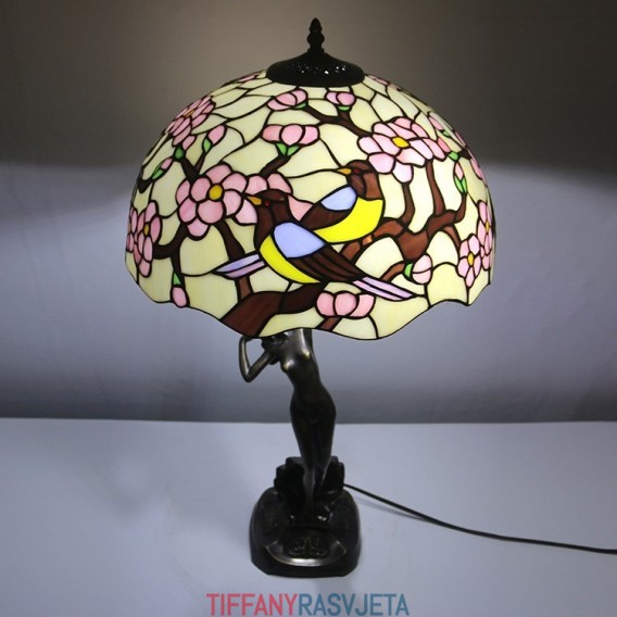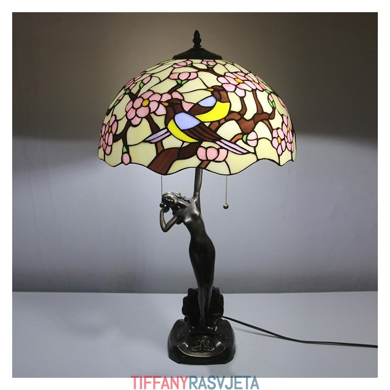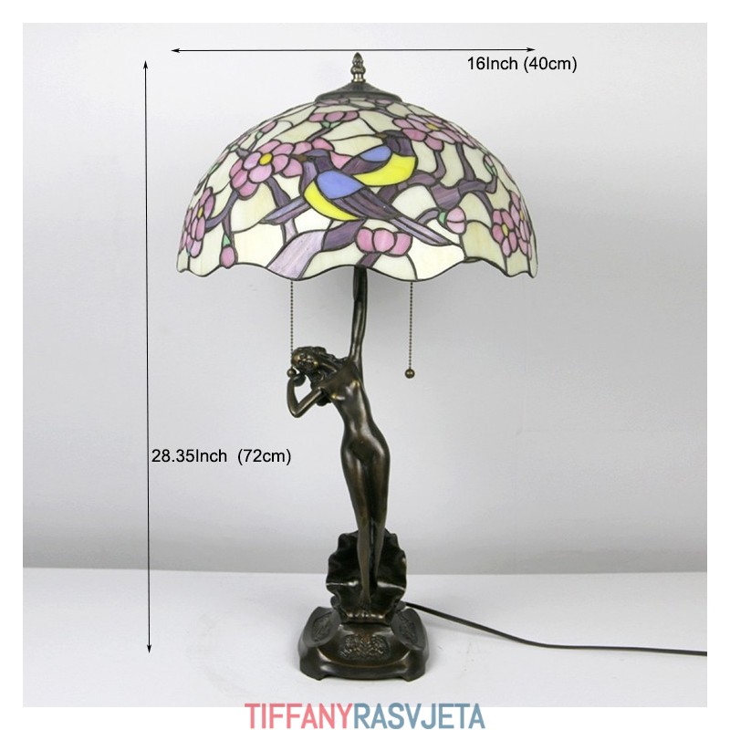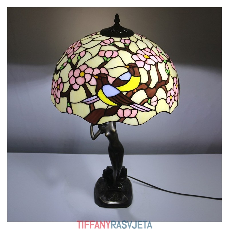 Ručno izrađena vintage Tiffany stolna lampa od 16 inča s dvije ptice, vitražom, luksuzna bankarska lampa u sjećanju, antikna bakrena baza