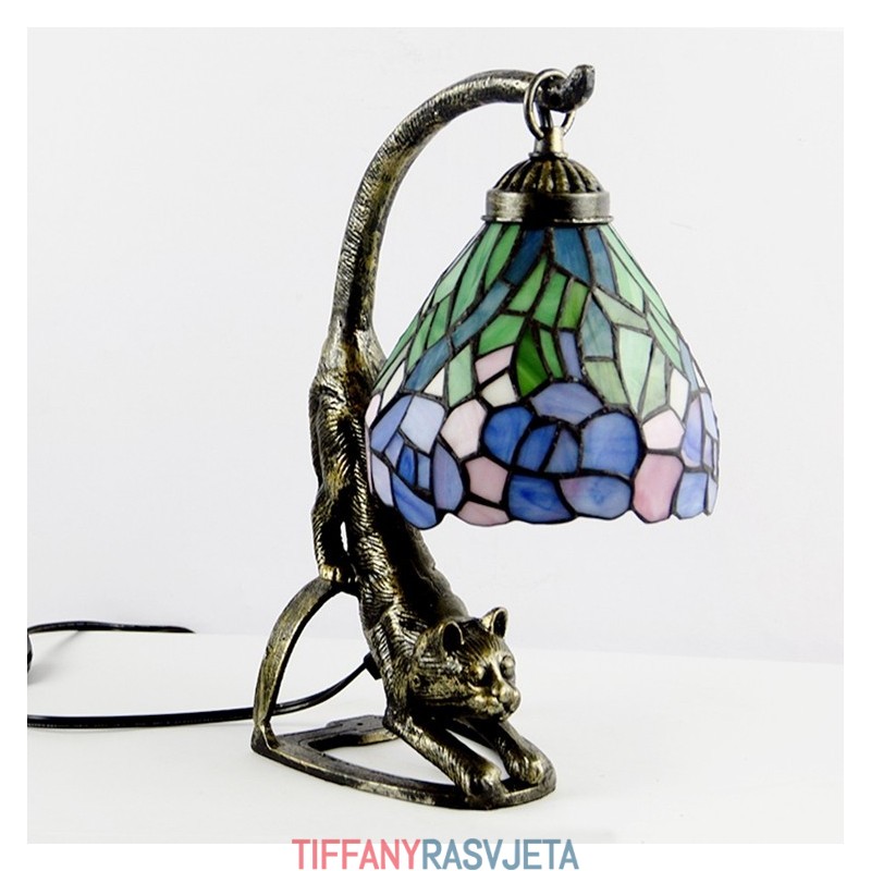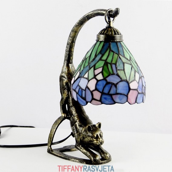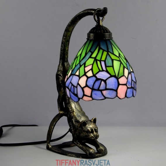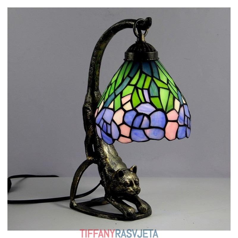 Ručno izrađena vintage stolna lampa u stilu Tiffanyja, antikna noćna lampa od vitraja s motivom glicinije i mačjim podnožjem, visoka 38 cm