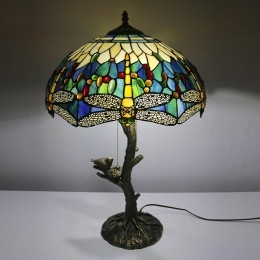 Ručno izrađena vintage žuta stolna lampa u stilu vitraja u Tiffany stilu s abažurom širine 40 cm i deblom u obliku ptičjeg gnijezda