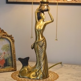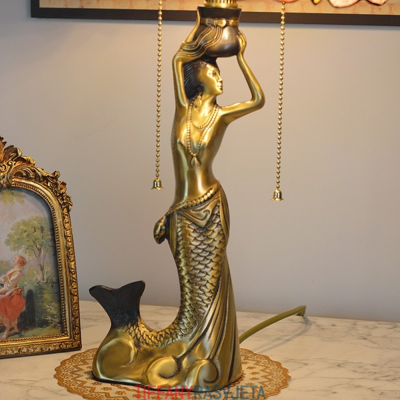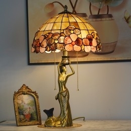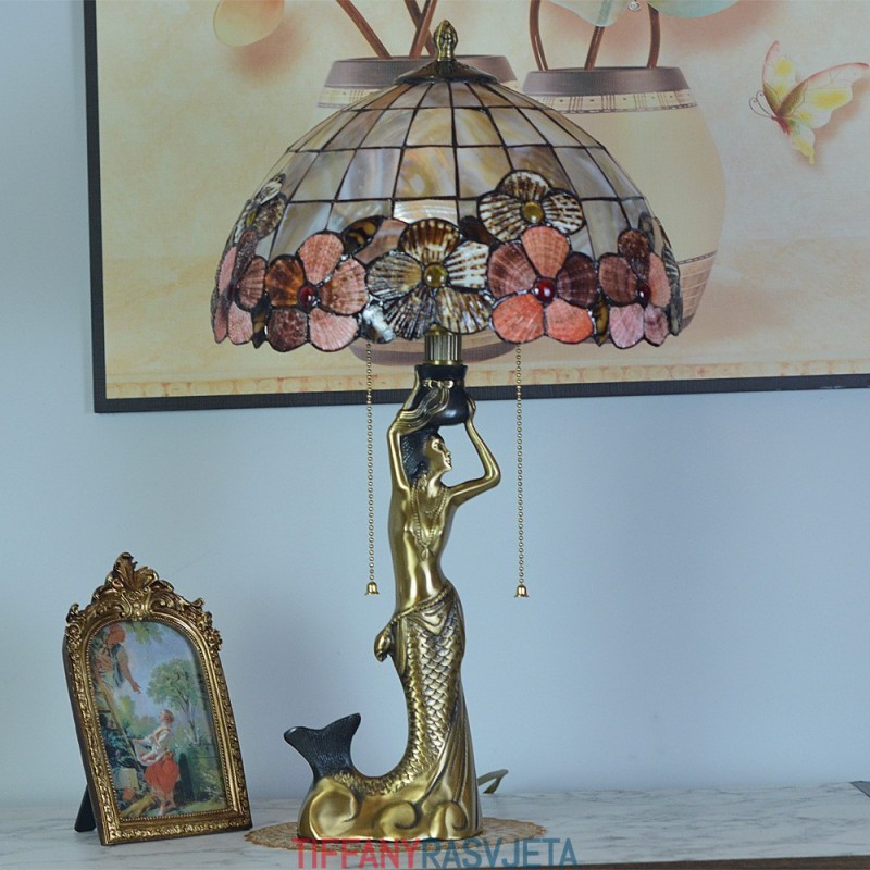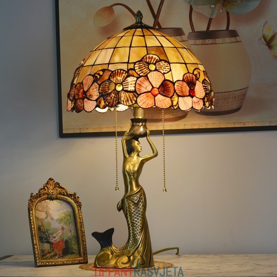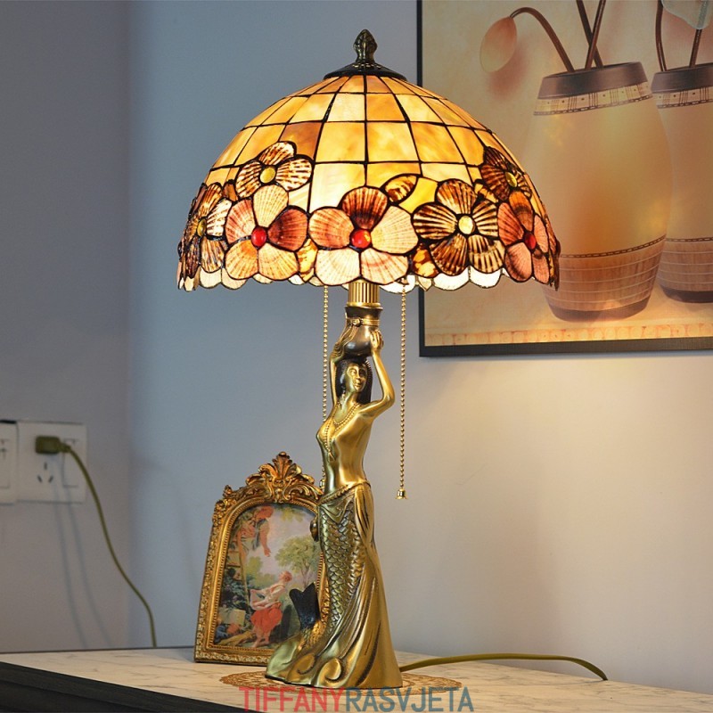 Ručno izrađena vintage 12-inčna luksuzna vitražna sjenila od školjki, sirena, čista mesingana baza, Tiffany stolna lampa