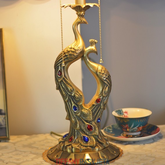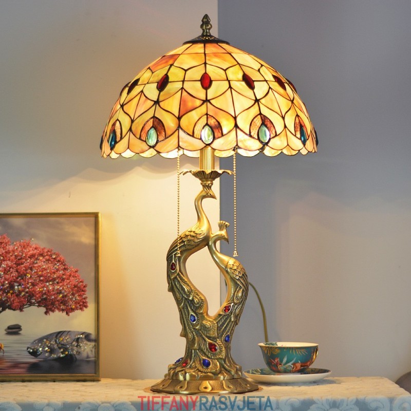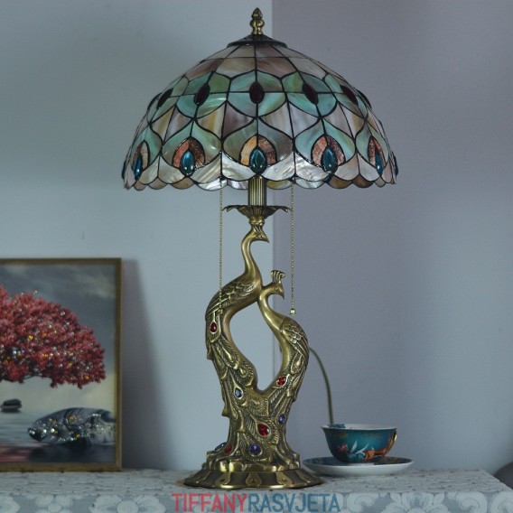 Ručno izrađena vintage 14-inčna luksuzna vitražna sjenila od školjke, Phoenix, čista mesingana baza, Tiffany stilska stolna lampa