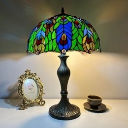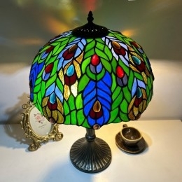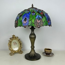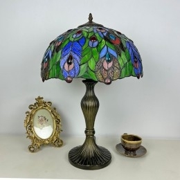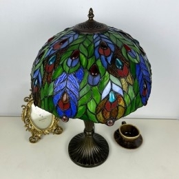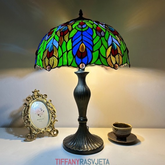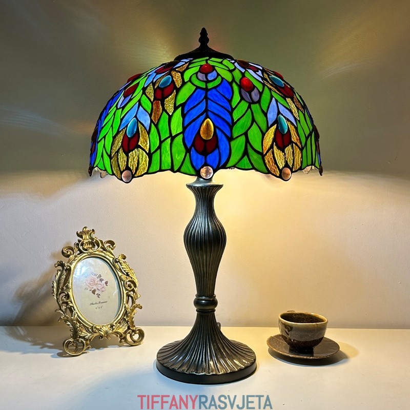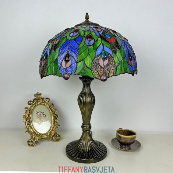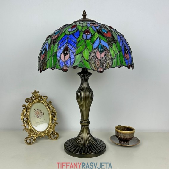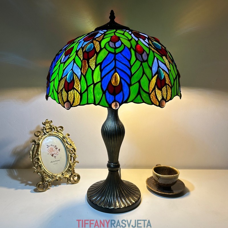Ručno izrađena vintage velika stolna lampa s abažurom od pauna od 40 cm, u stilu Tiffanyja, od vitraja