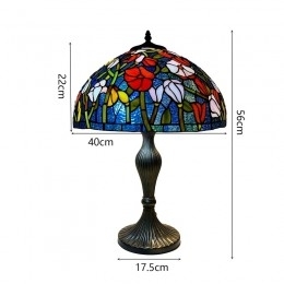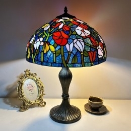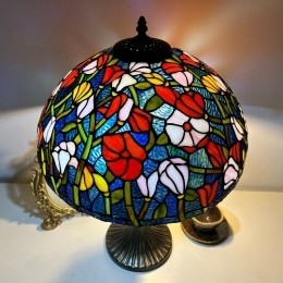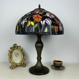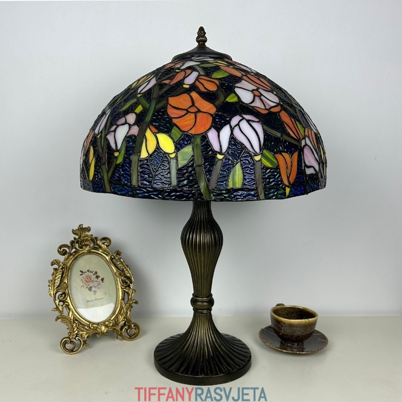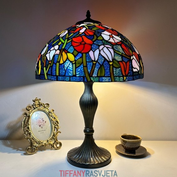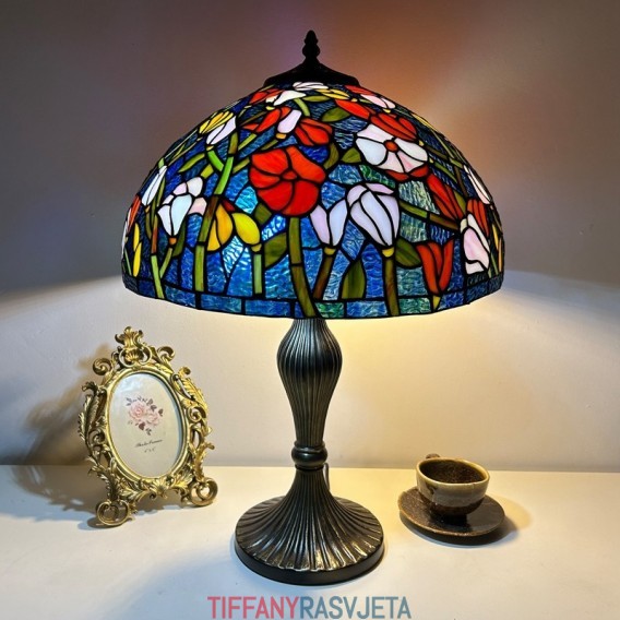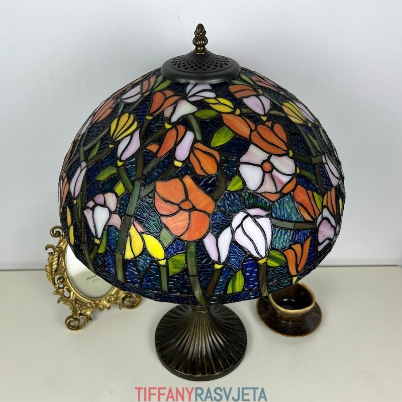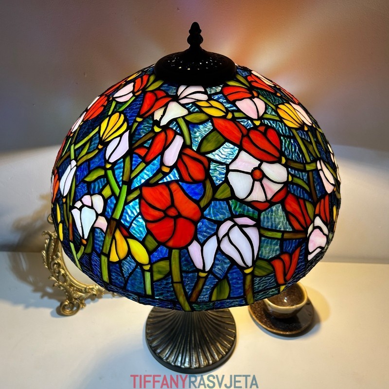 Ručno izrađena vintage velika stolna lampa s cvjetnim abažurom od 40 cm, u stilu Tiffanyja, od vitraja