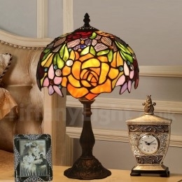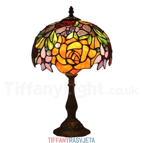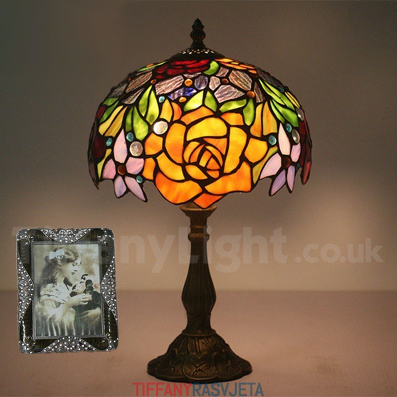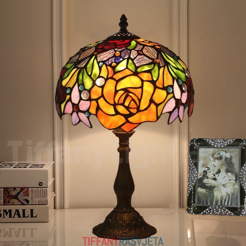 Ručno izrađena vintage 25-centimetarska Tiffany stolna lampa u stilu vitraja s ružom