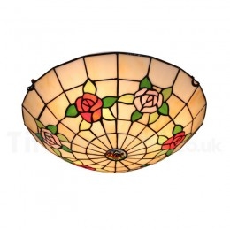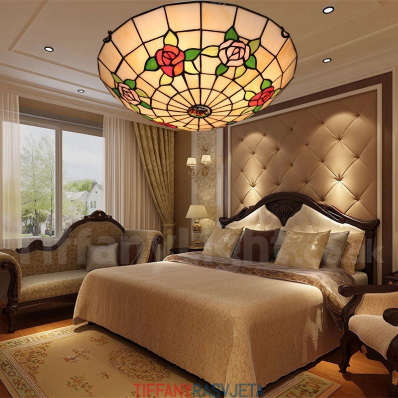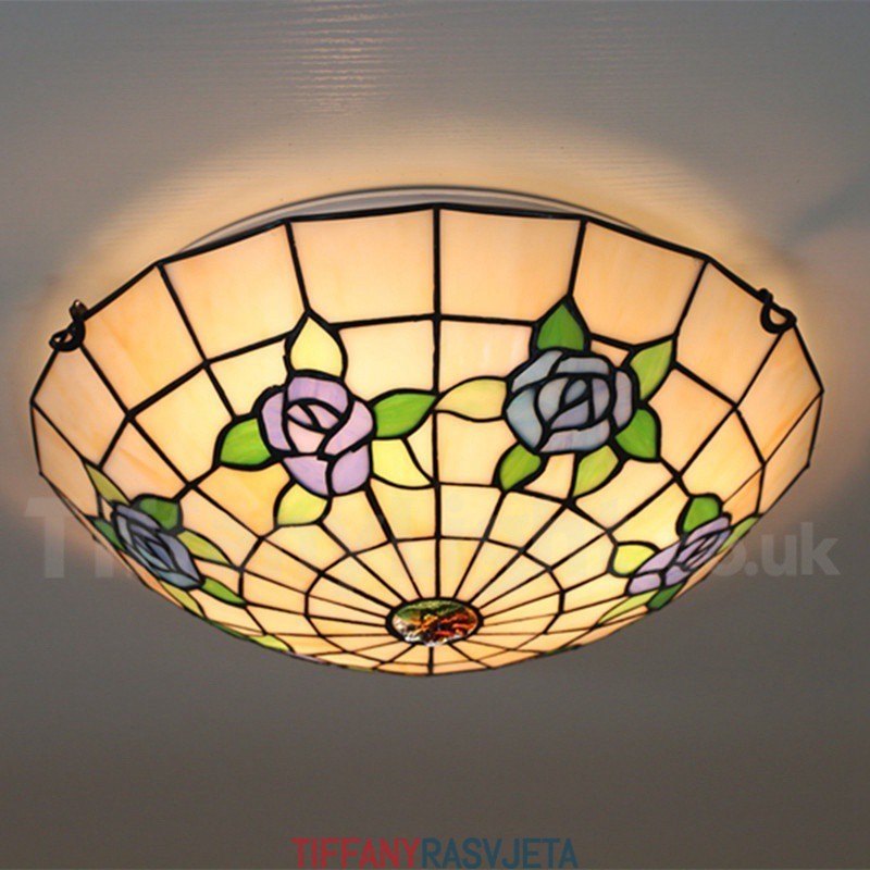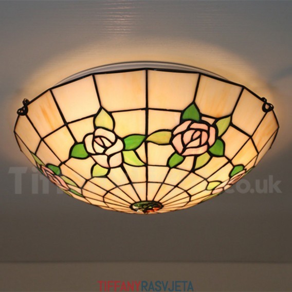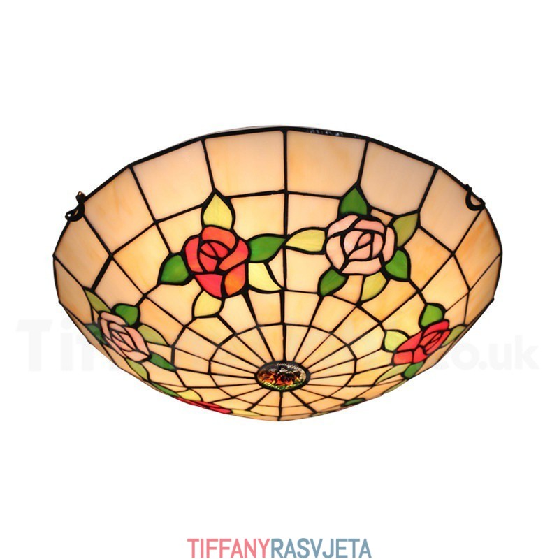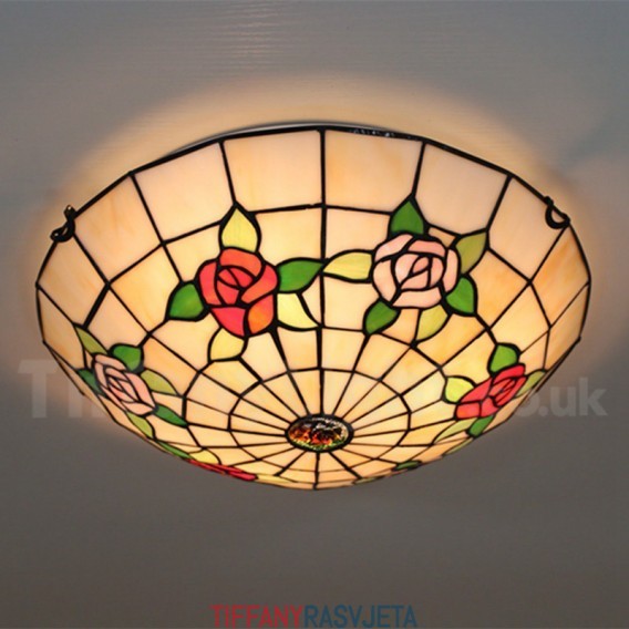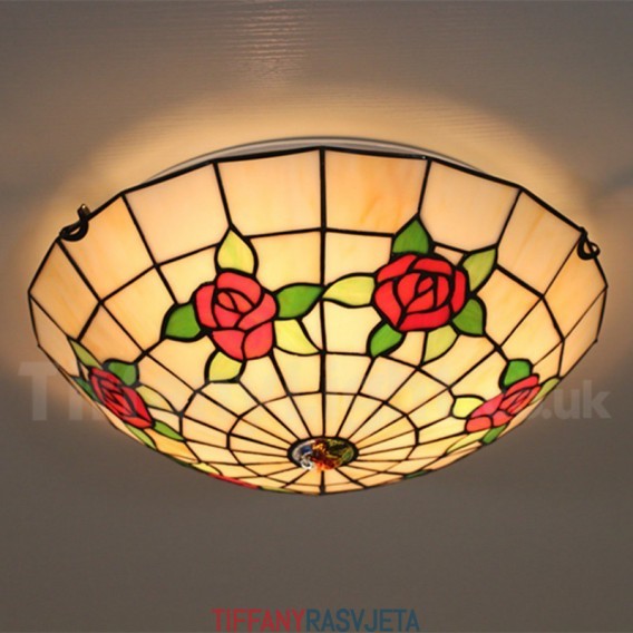 Ručno izrađena vintage 16-inčna ugradbena Tiffany svjetiljka u stilu vitraja s ružom