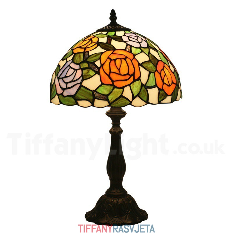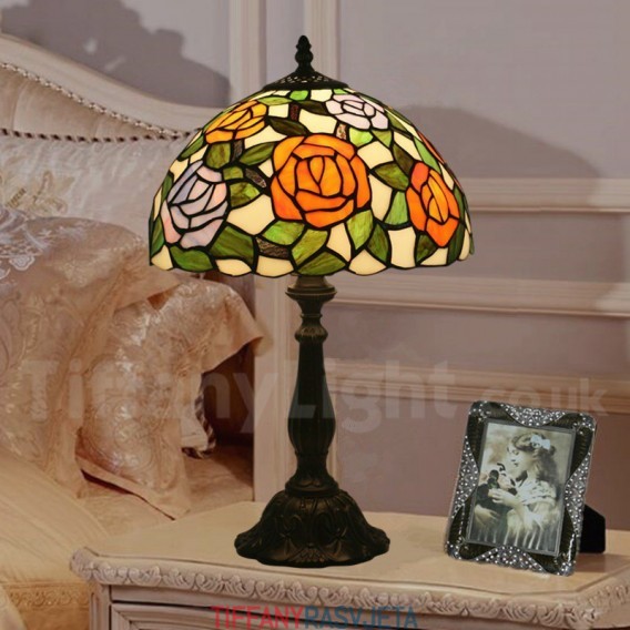 Ručno izrađena vintage 30 cm Tiffany stolna lampa u stilu vitraja s ružom