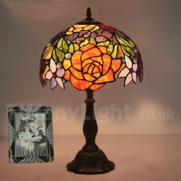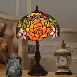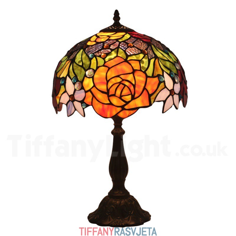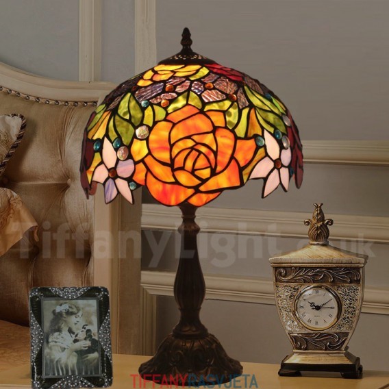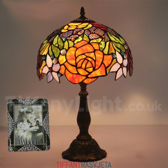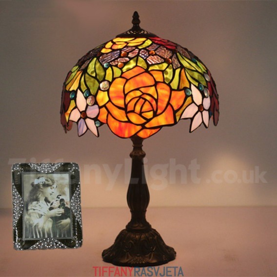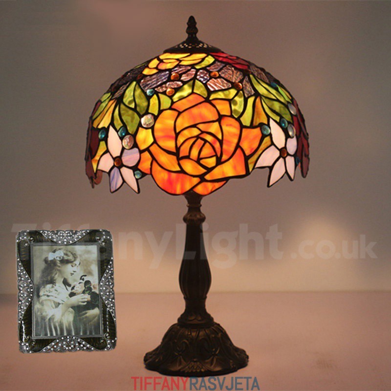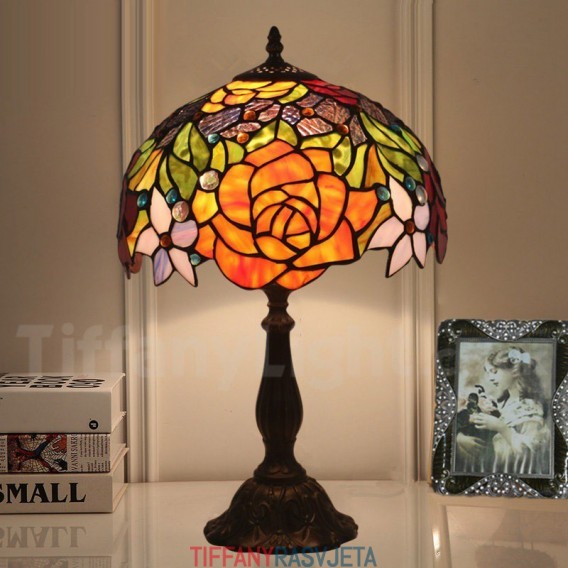 Ručno izrađena vintage 30 cm Tiffany stolna lampa u stilu vitraja s ružom