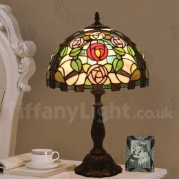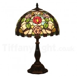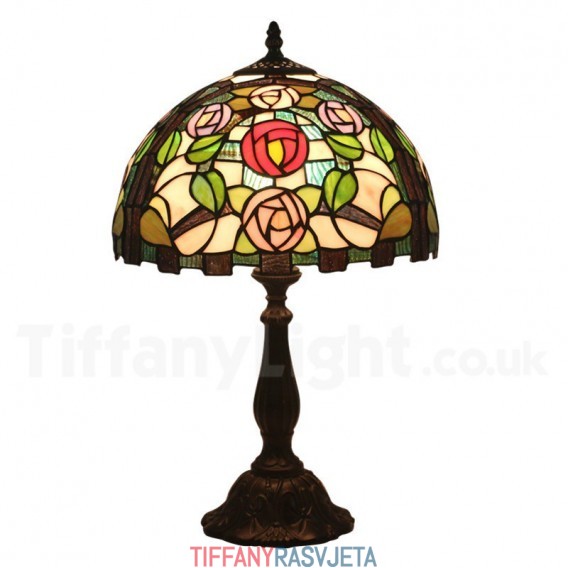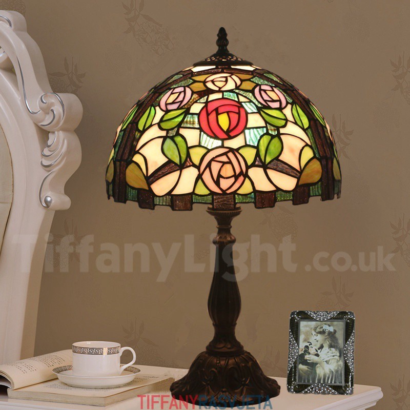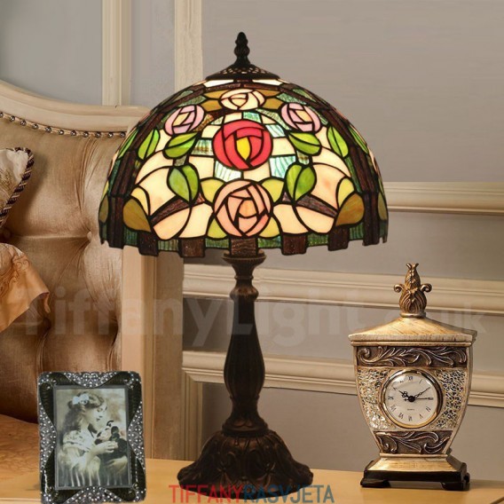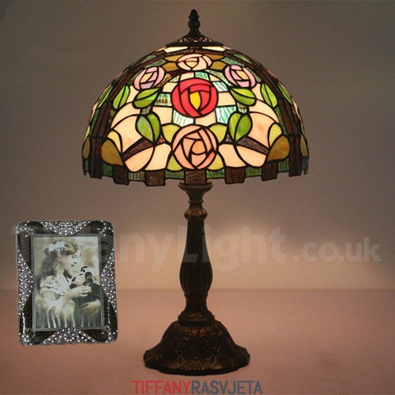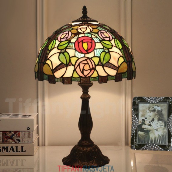 Ručno izrađena vintage 30 cm Tiffany stolna lampa u stilu vitraja s ružom